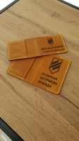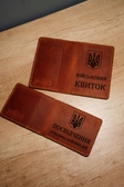 Обкладинка на посвідчення УБД. Маємо обкладинки з прозорими та звичайними кишенями. Обкладинка прошита саме ручним швом з натуральної шкіри що робить її дуже надійною. Ми використовуємо міцну але м'яку ПВХ пліку, яку закріплюємо з чотирьох сторін. Край шкіри заполірований тому захищений від вологи. Позаду обкладинки ми додали кишеню для перепусток.